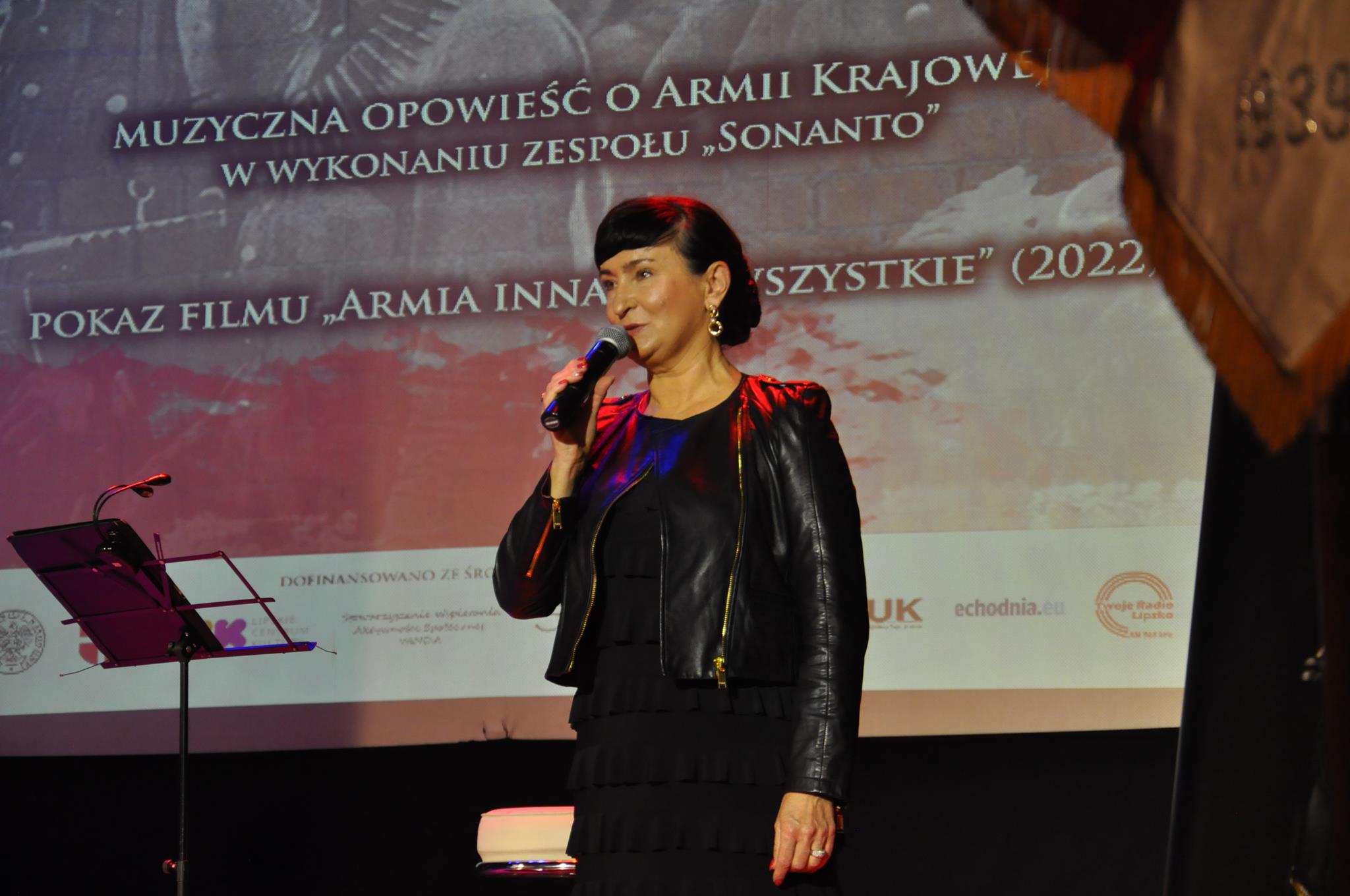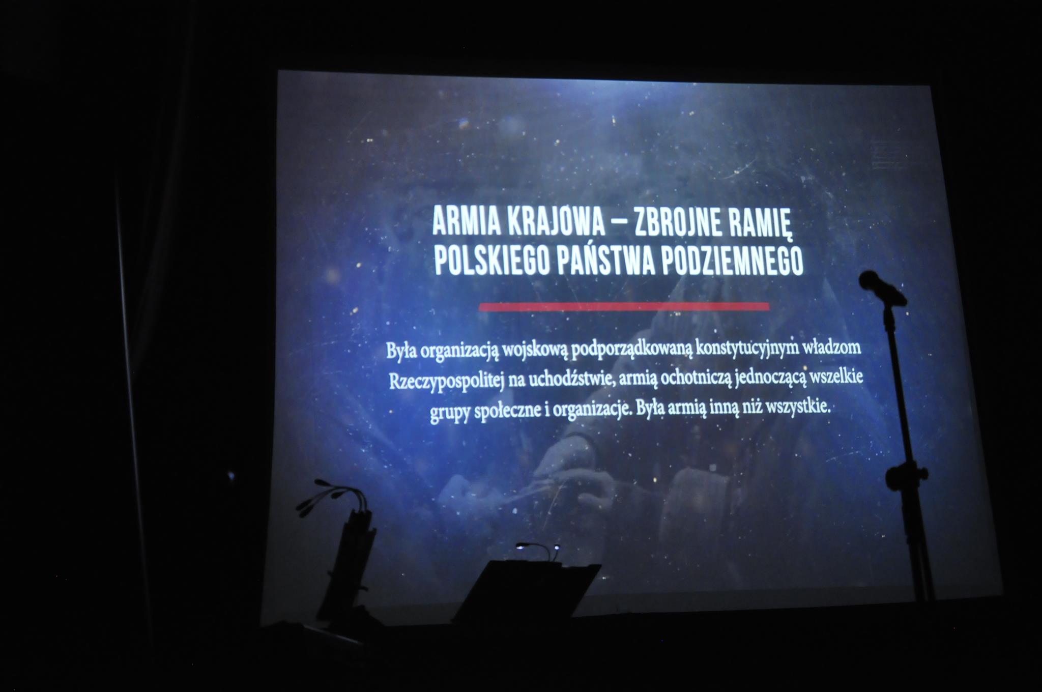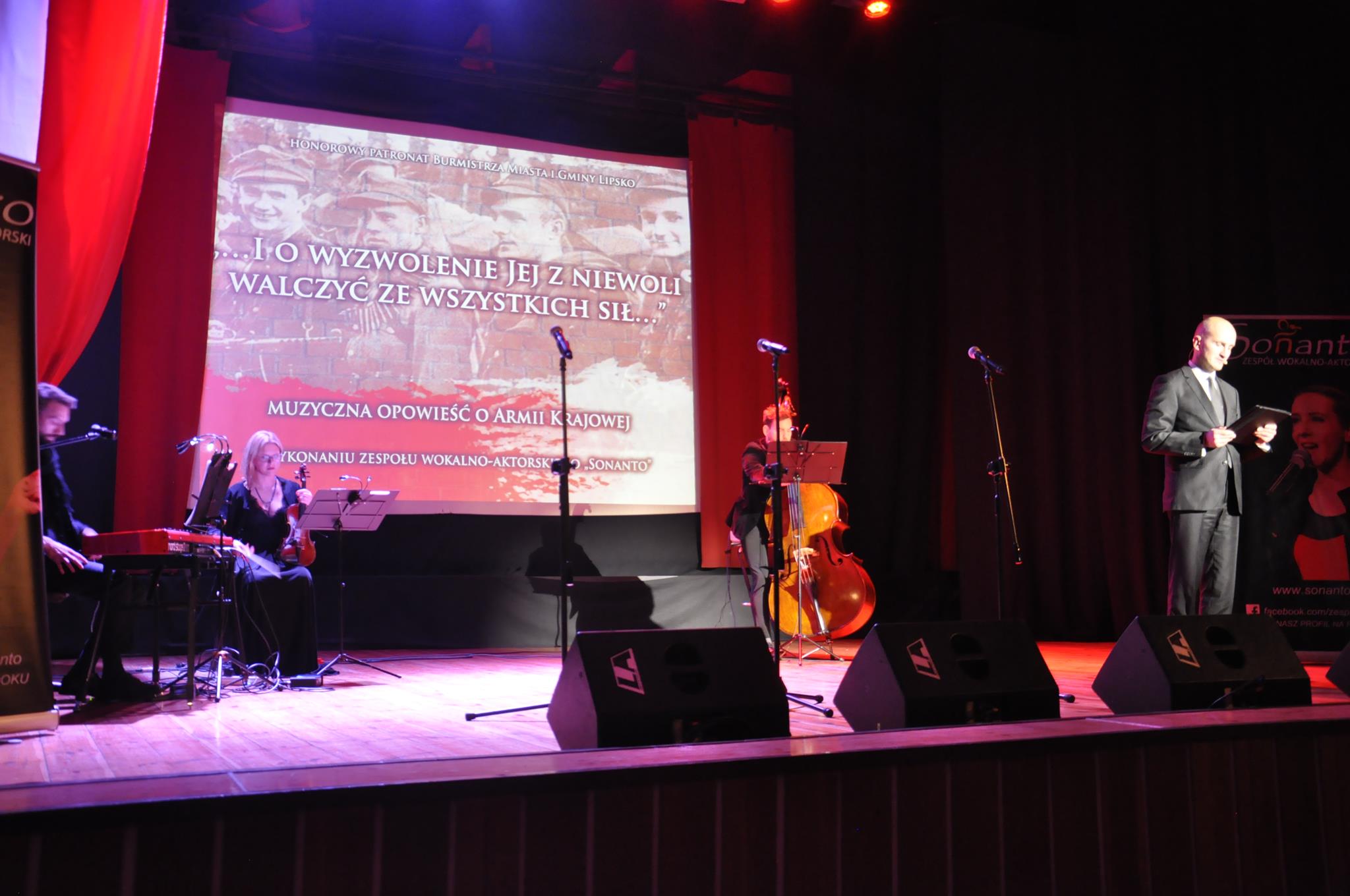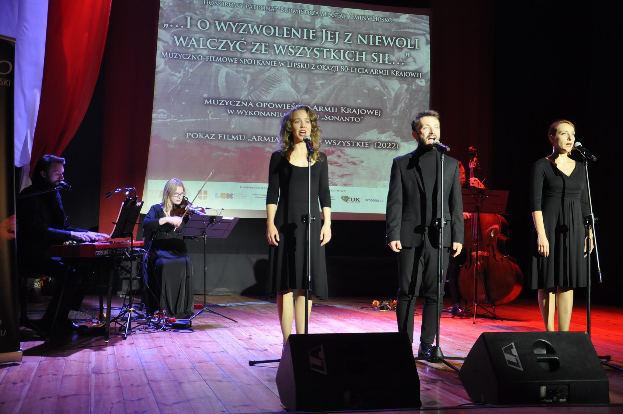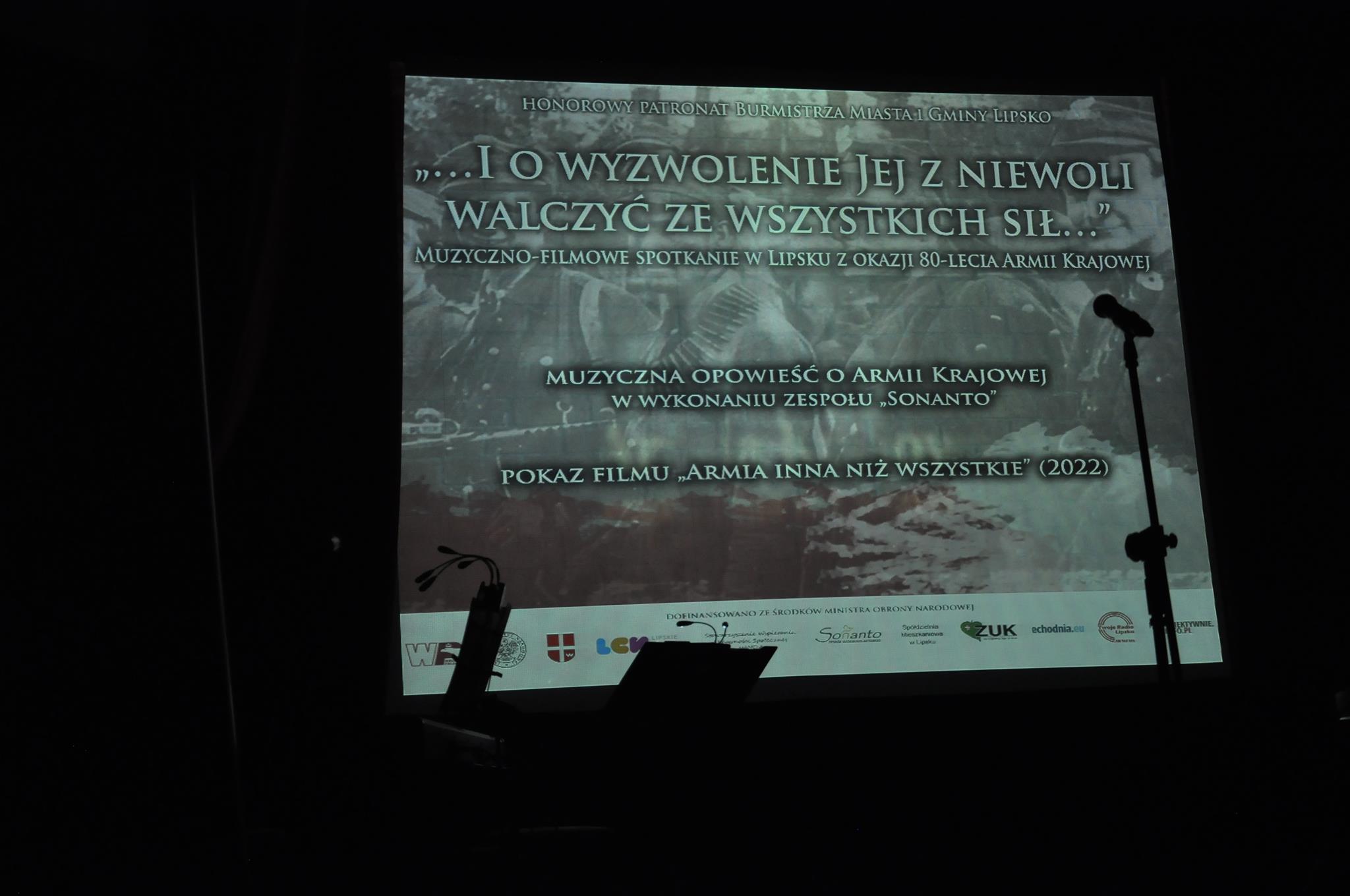 W pierwszej części spotkania wysłuchaliśmy muzycznej opowieści o Armii Krajowej w wykonaniu aktorów, wokalistów i muzyków zespołu wokalno-aktorskiego „Sonanto” wspaniałego zespołu tak pięknie pielęgnującego pamięć o najważniejszych wydarzeniach w polskiej historii. Na lipskiej scenie zabrzmiały m.in. „Modlitwa Armii Krajowej”, „Mała dziewczynka z AK”, „Biały Krzyż”, „Deszcz, jesienny deszcz” i wiele innych. W drugiej części natomiast widzowie zobaczyli krótki dokument pt. „Armia inna niż wszystkie”, film produkcji Instytutu Pamięci Narodowej, powstały w tym roku, właśnie na 80-tą rocznicę przemianowania Związku Walki Zbrojnej w Armię Krajową.